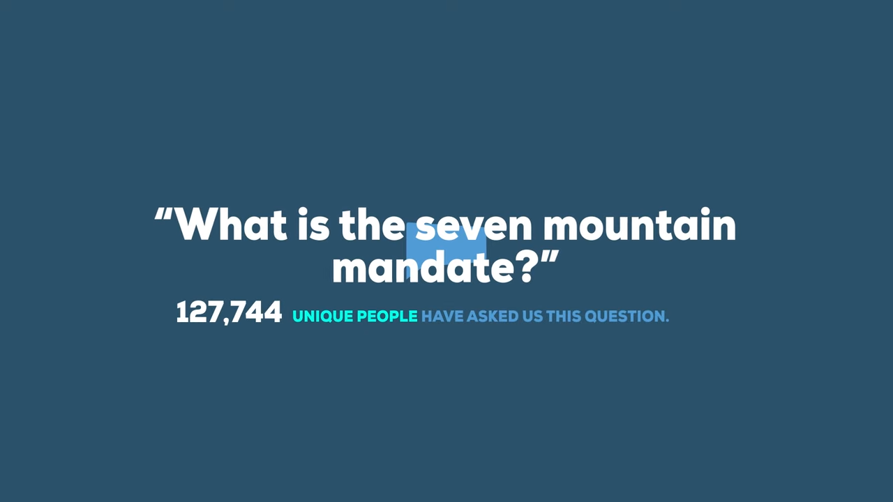 Bookmark this page to be informed about the radical changes associated with each mountain. Scroll down for news articles, podcasts, and videos about the seven mountains. To learn more about a particular mountain visit these dominion links: